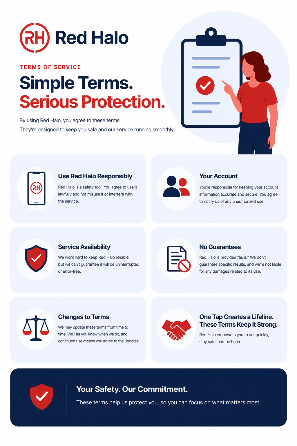 These Terms of Use (“Terms”) govern your use of the Red Halo mobile application and website (“Service”) operated by Red Halo Technologies, LLC (“Red Halo,” “we,” “our,” or “us”).